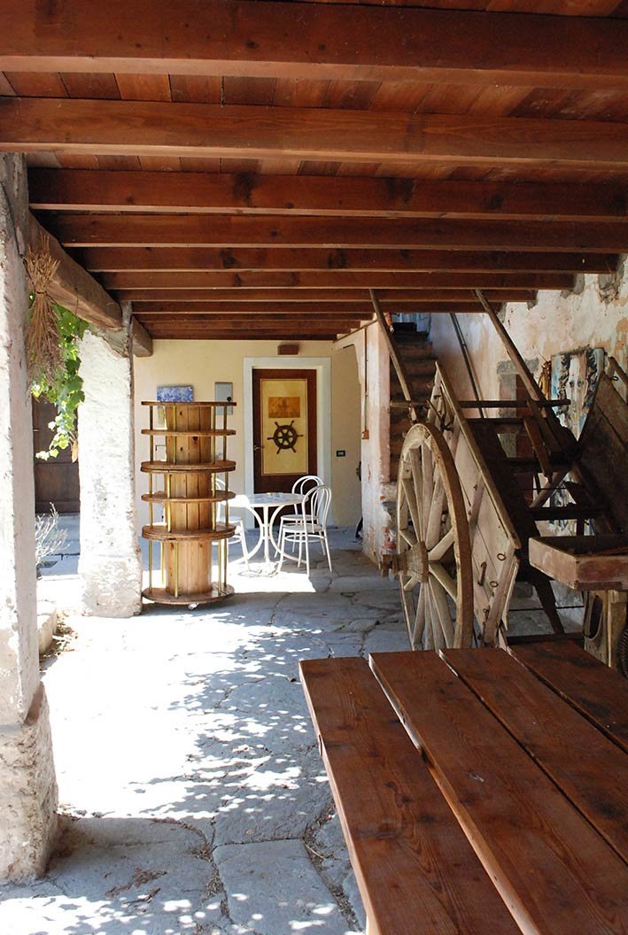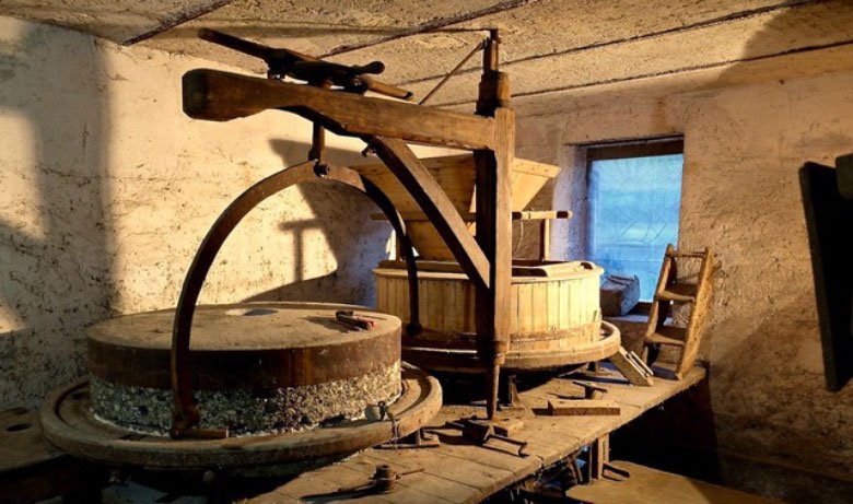 Besonders ist der Antrieb der Mühlsteine durch ein Hydraulikrad mit 5 Metern Durchmesser das gespeist aus einem Wehrdamm mit einem 20 Meter langen Kanal durch eine sogenannte „Multiplikator-Vorrichtung betrieben wurde. Im Innern des ehemaligen Mühlsteinraumes sind die beiden Getreidemühlsteine erhalten geblieben, von denen eine – wie in der Region üblich - zum Mahlen des Polenta Mehls (Mais) und die andere zum Mahlen von Getreide verwendet wurde.